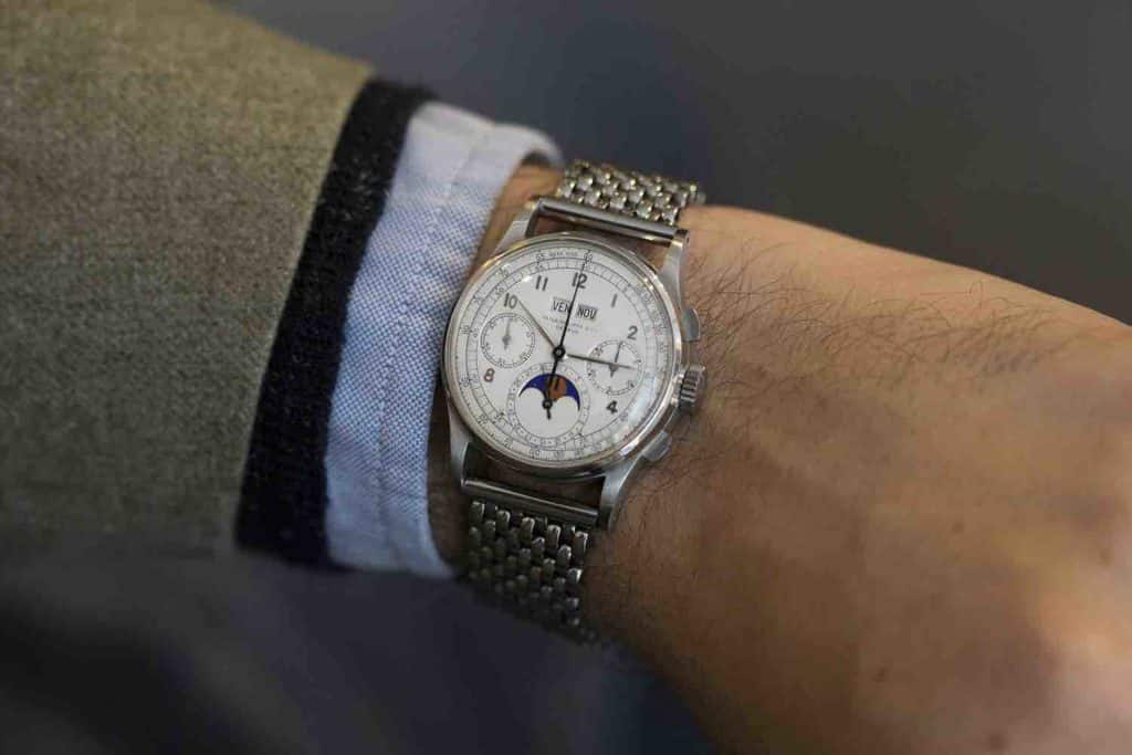 Nur 4 Beispiele von Patek Philippe Ref. 1518 sind in der Welt bekannt ; Dieses Modell wurde 1941 hergestellt und war der erste Armbandchronograph mit ewigem Kalender der Welt (mit Mondphasen und aus rostfreiem Stahl), der von einem Hersteller in Serie gefertigt wurde.